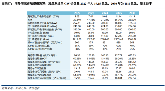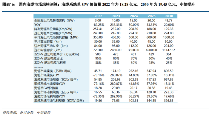 (2)海外市场方面:2023-2030年海风装机复合增速28.5%、海缆市场规模复合增速26.1%、海缆市场毛利规模复合增速25.8%,单GW海缆系统价值量2022年为19.15亿元,2030年为18.8亿元,基本持平。