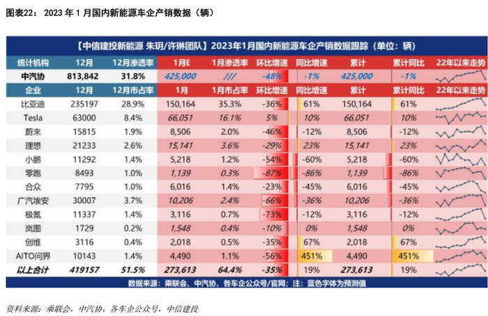 销量预期:从已知车型销量数据,叠加Tesla6.6万辆(产5.8,销含有Q4库存),预计1月销量合计42-43万辆(下修2-3万),主要系部分自主品牌1月出现批售和零售倒挂,1月渠道仍处于22年批售去库中,但我们维持23Q1批售合计160万+的预测,2月销量补回1月预测缺口。