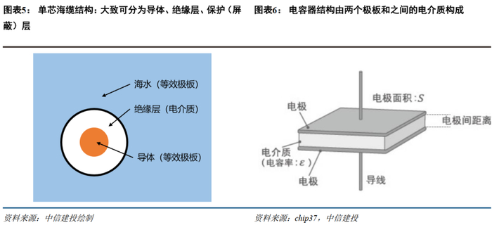 海缆运行在海水中,导体、绝缘层,与外界海水一起,构成了一个典型电容器结构,导体与外界海水为电容器的两个极板,绝缘层为电介质。因此,电缆具有电容值,在确定工况下,一段电缆的电容值与其长度成正比。