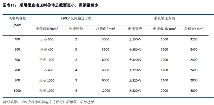 由于交流与直流方案的铜芯选择方案、电压等级、功率测算均有所不同,假设不考虑绝缘、铅套等成本,选择相同传输功率下的铜用量(或铜截面)对比更为合适,根据环评报告: