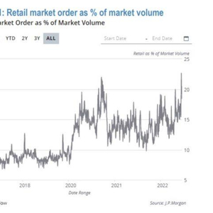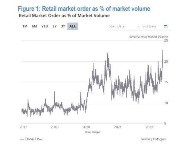 摩根大通根据交易所公开数据的最新测算结果显示,2023年1月下旬,来自散户大军的股票和ETF交易订单占市场总成交量的23%,甚至高于2021年散户抱团热潮时创出的历史纪录(22%)。