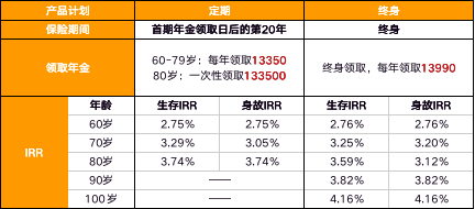 保障定期,生存IRR更高,80岁时的IRR就达到3.74%,其他大多养老年金产品很难达到这个水平。