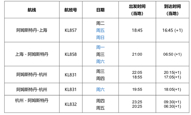 荷兰皇家航空1月30日起运营每周往返于阿姆斯特丹和上海之间的2个航班,由波音777 运营;每周运营往返于阿姆斯特丹与杭州之间的3个航班,由波音787-9运营。