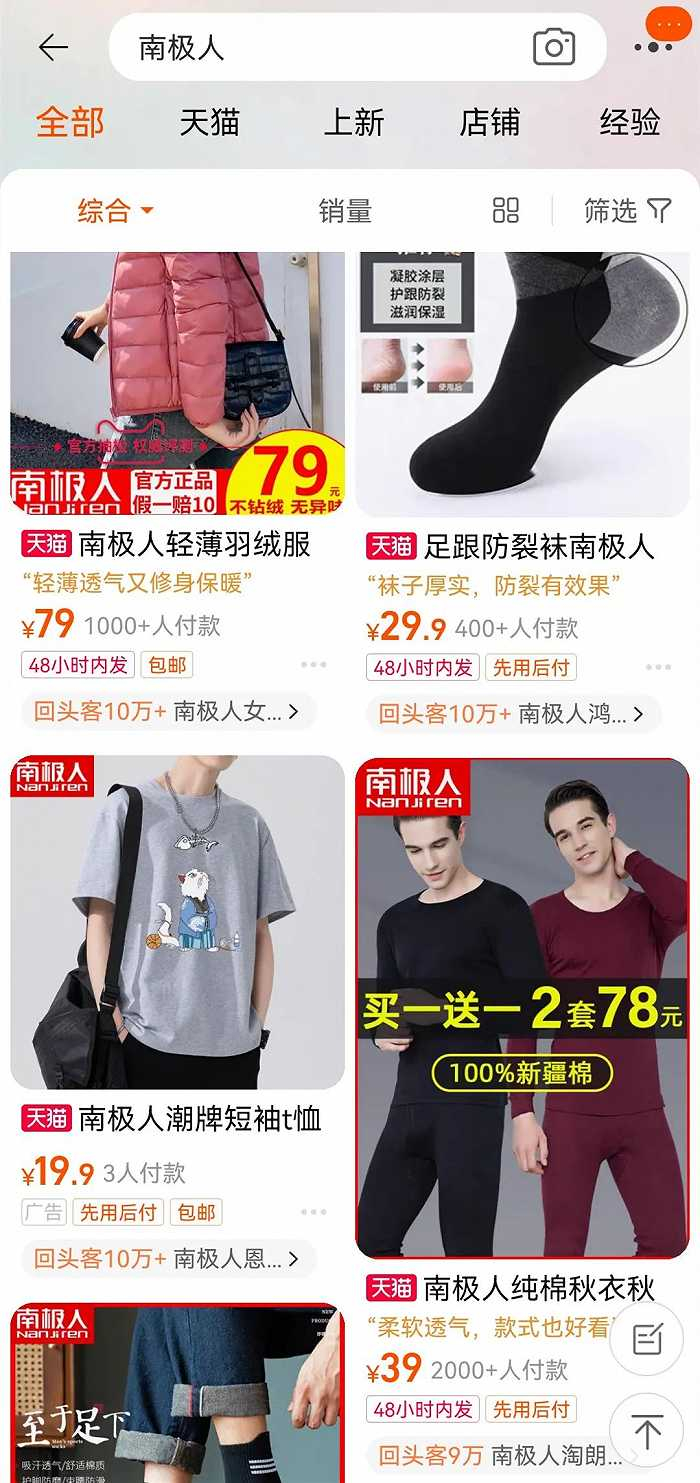 成立于1998年的上海南极人纺织品发展有限公司,发家是从做保暖内衣开始的。凭借着更薄、更暖、更舒适的特性,迅速风靡全国,公司在成立的第四个月就创造了1个亿的销售额。