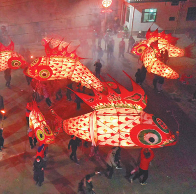 安徽黄山歙县汪满田村,村民嬉鱼灯庆祝年节,吸引许多村民和游客前来观赏。