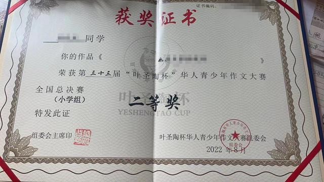 有家长提供的该比赛获奖证书照片显示,证书由“叶圣陶杯”华人青少年作文大赛组委会颁发。