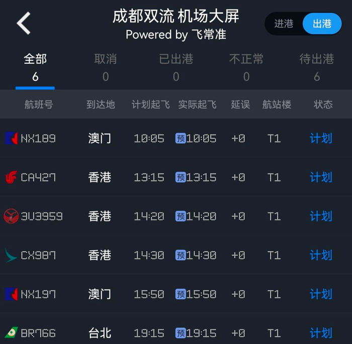 与此同时,自2023年2月6日零时起,全面恢复内地与港澳人员往来后,香港、澳门也是团队游的主要目的地。今日成都直飞香港、澳门的出港计划航班共有5班,分别是3班、2班。其中,首个出境飞香港的地区航班由国航执飞,航班号为CA427,计划于下午13:15起飞。