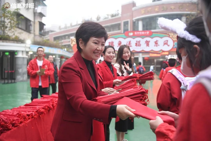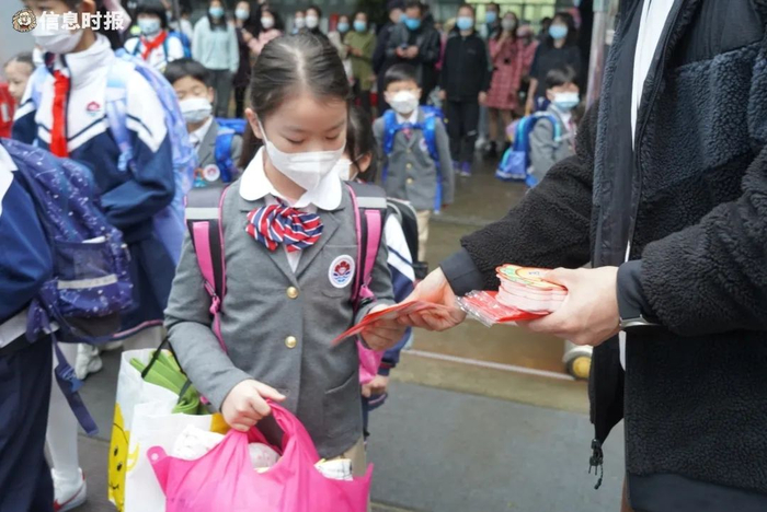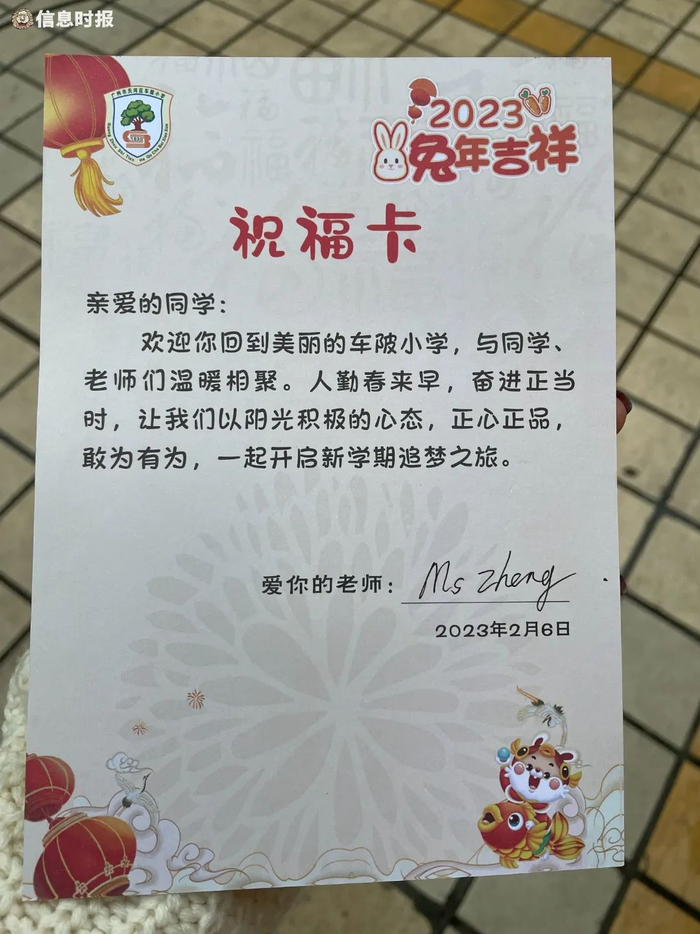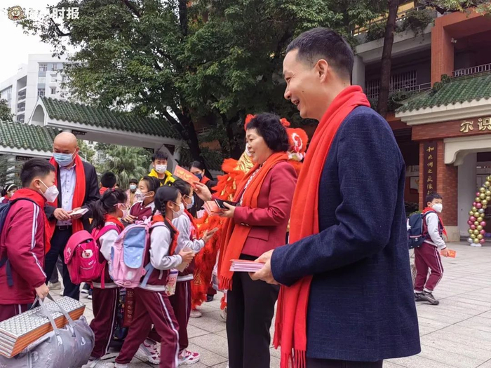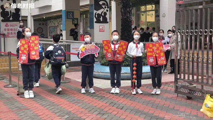 今早,珠光路小学的老师们戴上新年红围巾在校门口迎接同学们的到来,还为同学们准备了开学礼物卡片。