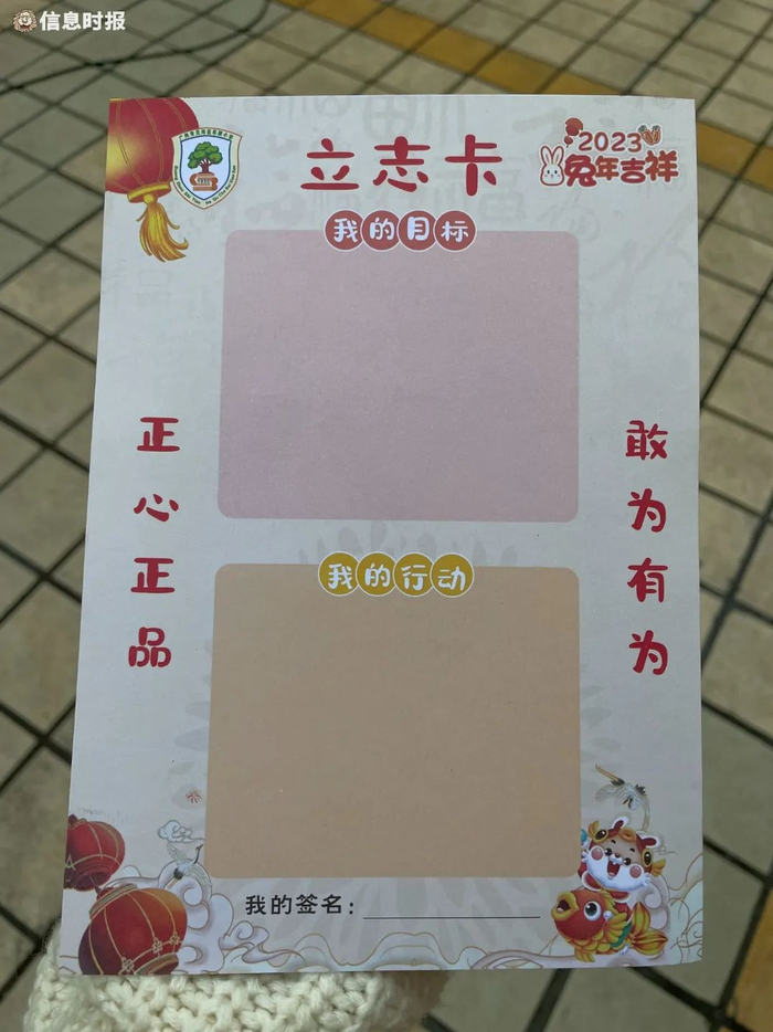校门口,学校领导和老师们在两旁迎接每一位返校的同学,并送上“祝福卡”。祝福卡正面是欢迎同学们回校的祝福语,背面则是立志卡,同学们可以在新学期伊始填写“我的目标”和“我的行为”,在崭新的学期立下新期望。