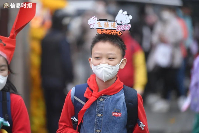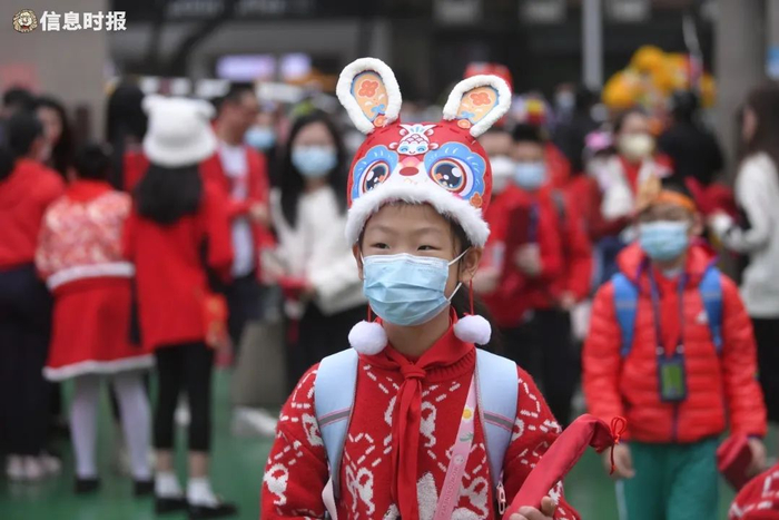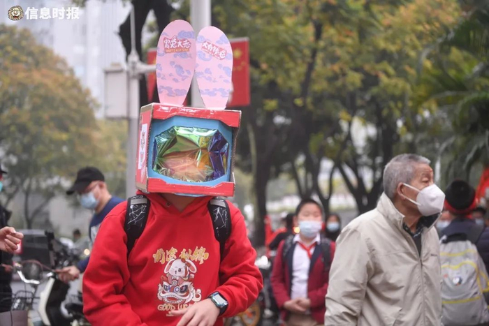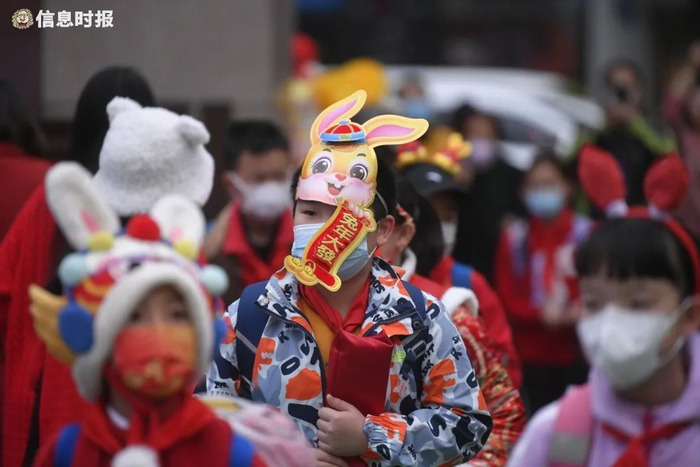 东风东路小学,戴上兔年特色头罩返学的学生。