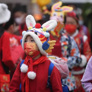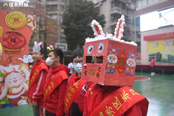 学生戴上兔年特色头罩返学。