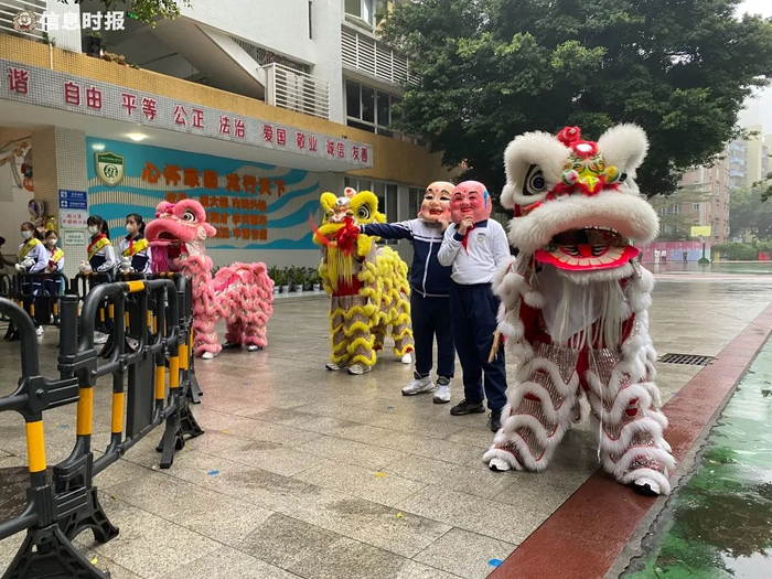 “今天终于可以回到学校看到老师和同学们了!”2月6日早上7点40分左右,还未走到车陂小学校门口,远远就能感受到新学期的热闹气氛,“咚咚锵咚咚锵……”车陂龙狮队、车陂小学龙狮队的队员们一大早已经到学校门口就位舞狮,锣鼓声声迎接同学们回校。