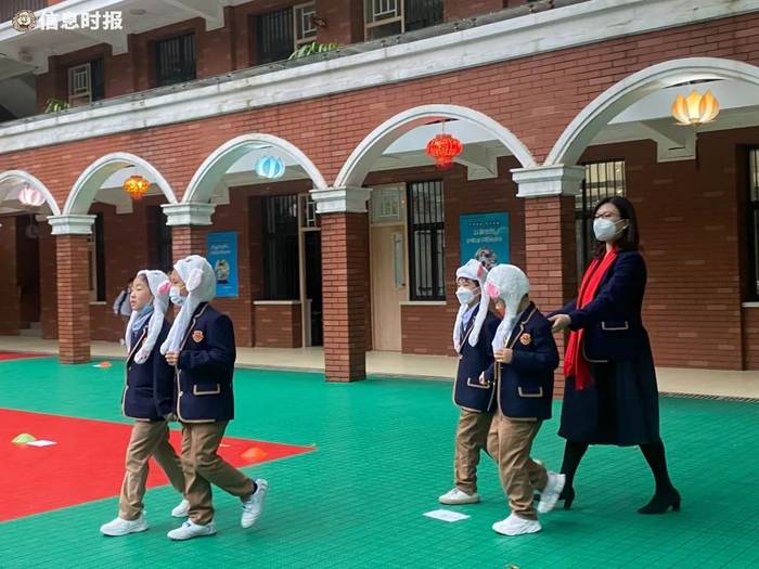 2月6日早上7点50分,广州市海珠区宝玉直实验小学(光大校区)传来阵阵锣鼓声。舞狮小队的热情感染了每一位返校的同学。校长和老师在校门口迎接同学们的到来,为同学们派发口罩和“大展宏兔”“兔飞猛进”卡片。