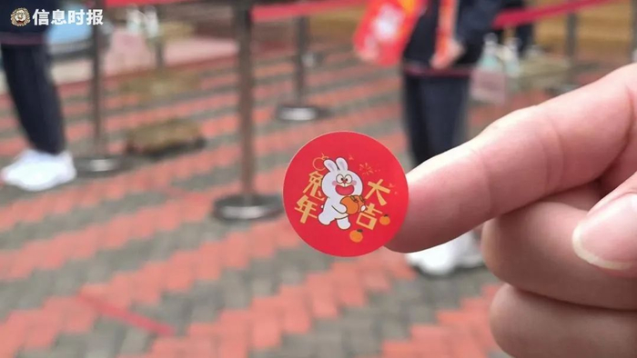 校长和老师们在门口迎接同学们,为同学们送上“兔年大吉”的贴纸。