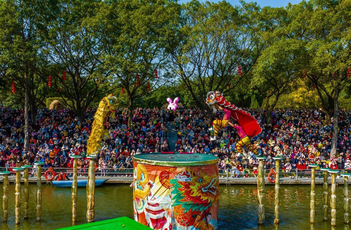 ↑2023年1月24日,春节期间,众多游客观赏南海西樵山天湖水上高桩醒狮表演(无人机照片)。
