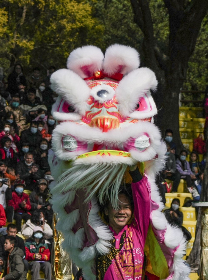 ↑2023年1月24日,春节期间,狮团在南海西樵山表演醒狮贺新春。