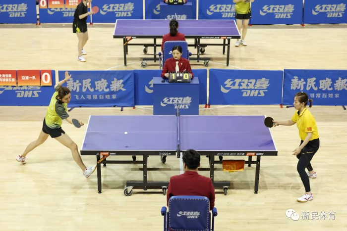 卢湾体育馆正中央,本届新民晚报红双喜杯的决赛正在进行。甲乙丙三个组别共6张球台的对阵双方,拼杀激烈。近3个小时后,才全部决出胜负。甲组最精彩,上海悦隆乒乓球俱乐部和沿浦一队聚集了一批前国手,尤其是最后一场双打,双方比分交错上升,现场观众的叫好声一浪高过一浪。看台上,国际乒联终身名誉主席徐寅生看得津津有味,和身旁的王励勤讨论双方的技战术。