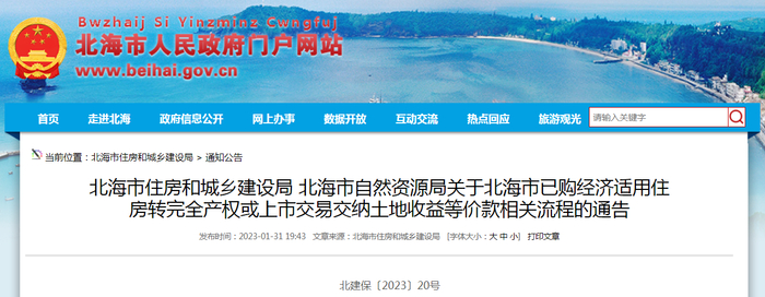 北海市住房和城乡建设局 北海市自然资源局关于北海市已购经济适用住房转完全产权或上市交易交纳土地收益等价款相关流程的通告