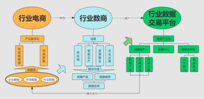 当然,行业电商向行业数据交易平台发展绝非易事刘心田坦言,“我认为至少要分两步走。第一步是行业电商向行业数商的转型。虽然只有一字之差,但两者还是有较大区别——行业电商关注于产业数字化,更多通过企业数据、市场数据、行业数据开展供应链管理、市场营销等服务;而行业数商则须立足场景,从供应链、智能生产、资源整合、企业治理等多个角度设计解决方案,通过数据产品或数据服务的形式开展行业数据应用。电商转数商,既要扩展数据资源,又要深入行业场景,相应的市场需求是非常巨大的第二步是行业数商向行业数据交易平台的提升。从数商到平台,企业的角色或发生变化,实质是要把数据流通交易产业化。产业化意味着更多的商机、更大的市场。行业数据交易平台不仅可以成为行业数据资产的管理运营者,还可以从事行业数据中心,甚至可以组织共同体,通过政产学研金服用集成资金技术、人才智力等资源为行业全面赋能。