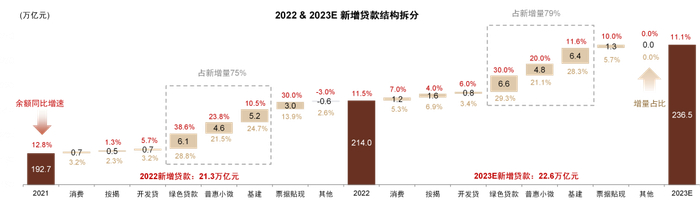 预计一季度 “开门红”延续,全年实现贷款多增。由于2022年总体信贷需求偏弱,月度之间信贷波动幅度较大,我们预计2023年疫情影响减弱、需求企稳的环境下信贷投放能够相比去年更为稳健。我们预计一季度开门红能够保持较强水平,实现同比多增。全年来看,我们预计2023年新增贷款和社融规模分别达到22.6万亿元/33.5万亿元,分别同比多增1.3万亿元/2.5万亿元;预计2023年信贷结构相比2022年有所改善,基建、普惠小微、绿色贷款、制造业等领域占比超过80%,房地产贷款占比低于10%。