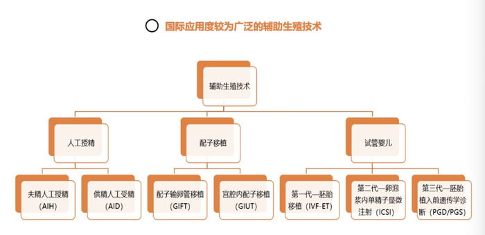 辅助生殖技术主要由人工授精、配子移植和试管婴儿构成。人工授精可再细分为夫精人工授精(AIH)和供精人工授精(AID)。配子移植可分为配子输卵管移植(GIFT)和宫腔内配子移植(GIUT)。试管婴儿则分为三代,每一代试管婴儿适应不同的患者,也是成功率最高的一种方式。