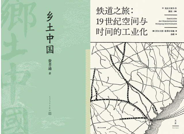 左:《乡土中国》,费孝通 著,人民文学出版社,2019年9月。右:《铁道之旅:19世纪空间与时间的工业化》,[德]沃尔夫冈·希弗尔布施 著,金毅 译,上海人民出版社·世纪文景,2018年7月。