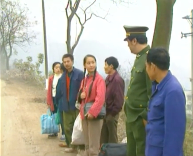 这是电视剧《山城棒棒兵》(1997)的画面,在上世纪90年代乡村泥路边,站着等待大巴的男女,手提大包小包。