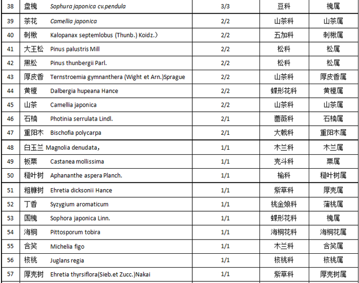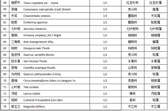 在61个属中,木兰属和松属各有4个种,栎属有3个种,冬青属、厚壳树属、槐属、槭树属和山茶属中各有2个种,其余53个种属于53个属。