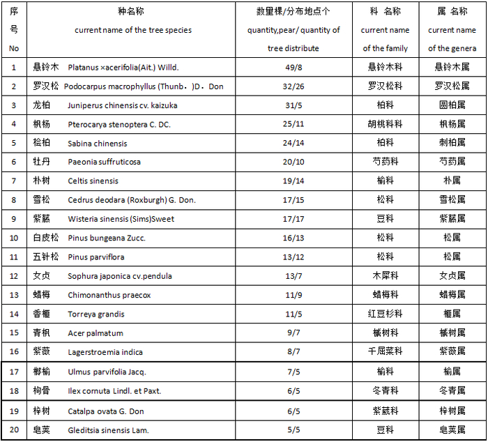 如果以一个树种同时满足数量50棵、分布地方30个为条件的话,那么又可以从古树26个种中分出最普遍适用树种6种和一般适用树种20种。