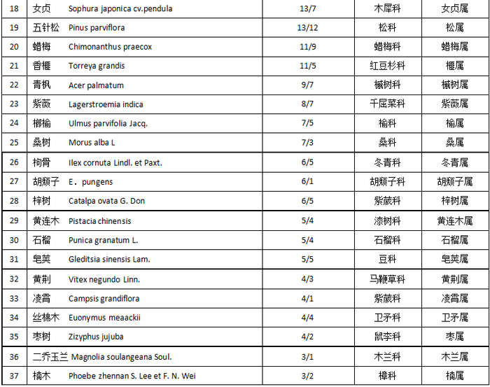以分布在上海陆地5个和5个以上地方的上海古树种为上海市普遍适用的树种,以满足数量50棵、分布地方30个为条件,将上海古树分成最普遍适用树种和一般适用树种2组的划分和提法是否妥当,值得商榷,但其方法可作为参考。