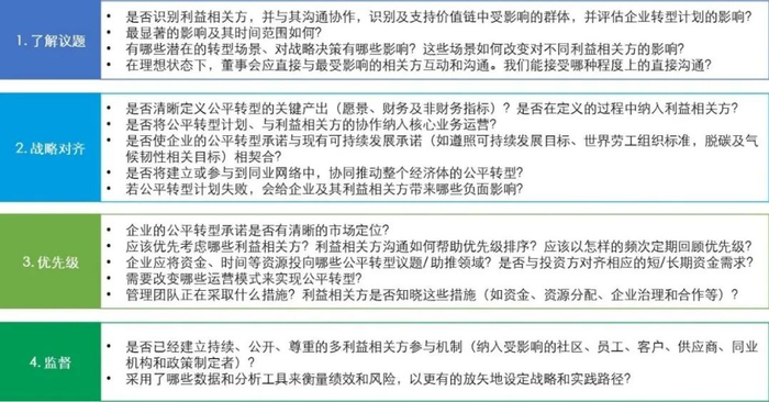董事会可以聚焦下述四方面的问题,协同首席执行官和团队推动公平转型。同时,推动企业与社区、员工、政府、投资者和供应链等利益相关方的参与和互动,助力加速公平转型。