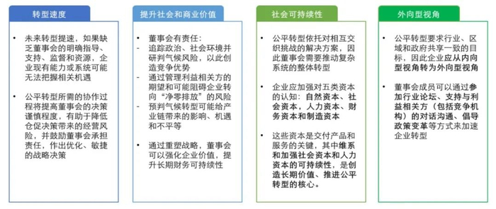 推动董事会关于公平转型的决策:优先管理相关事项,让高管承担责任、将可持续发展纳入企业战略、分配所需资源等;