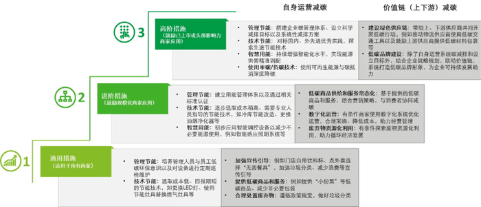 从自身运营减碳和价值链减碳两个维度,总结出适用于不同规模、不同减碳阶段餐饮商家的三阶段行动指引(如下图所示),分别为通用措施、进阶措施和高阶措施,以辅助餐饮商家由点及面、由易到难地实现低碳转型。