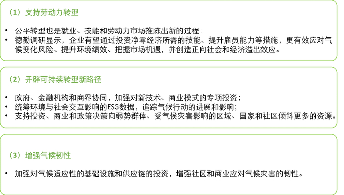 “公平转型”即通过倡导气候行动中的公正和公平,最大化社会和经济效益,同时通过与潜在受影响群体的沟通、保护劳工权益免受损害等方式来减少风险。
