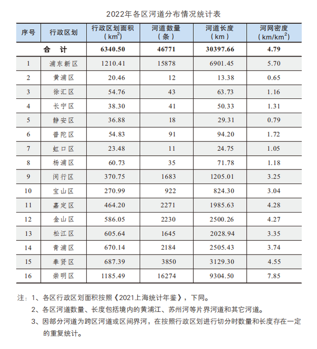 根据上海市水务局发布的《2022年上海市河道(湖泊)报告》,截至2022年底,上海共有河道46771条,长30397.66公里,总面积为577.438平方公里,河网密度达4.79公里/平方公里,即平均每平方公里土地上的河道长度加在一起有4.79公里。同时,上海还有51个湖泊,总面积为75.4975平方公里。