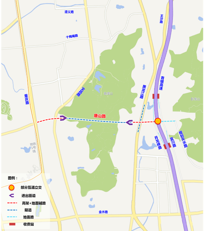 根据项目建议书,青银高速公路增设唐山路互通及连接线工程西接重庆路唐山路互通立交,东接天水路,全长约3公里。主要建设内容包括路基、路面、桥涵、隧道、交叉、交通工程及沿线设施、环境保护与景观、管线、其他等工程。