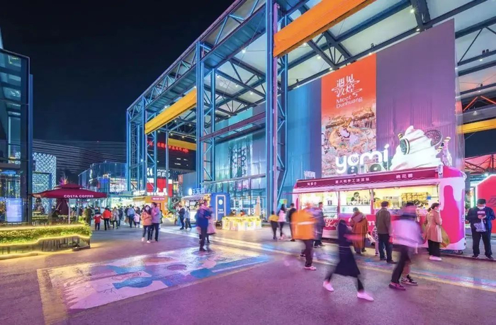 配套商业区面积五万多平方米,分为四层:地下二层和三层为公共停车场,共有车位约3000个;地下一层为群落式建筑,中央为大型活动广场,周围汇聚了超过170个时尚特色品牌——口味各异的餐饮店、各类文化体验品牌、众多酒吧及运动品牌旗舰店等;地面层除了举办一些季节性活动外,西侧园林区域还建有6800平米华熙LIVE·轻探险乐园——包括空中乐园、城市探洞、淘矿工厂、时空滑道四个项目;北侧的网红小吃街区——调调街占地面积约2000平方米,分成上下两层,由工业感十足的集装箱通过不规则错落改造而成,主打创意、网红和传统小吃,云集了47家餐饮小店及潮店,在这里市民可一站式享受到各种特色美食。