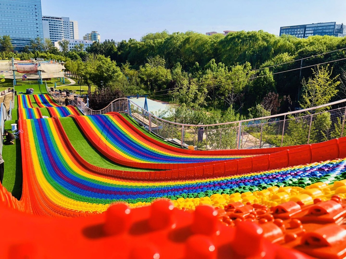除此之外,这里还有羽毛球、网球、足球、卡丁车等10多项运动场地,以及为小朋友们准备的趣味运动设施,如灯光滑梯、音乐喷泉,小火车、空中穿越、124米长的彩虹滑道等等,让孩子们通过运动锻炼身心。