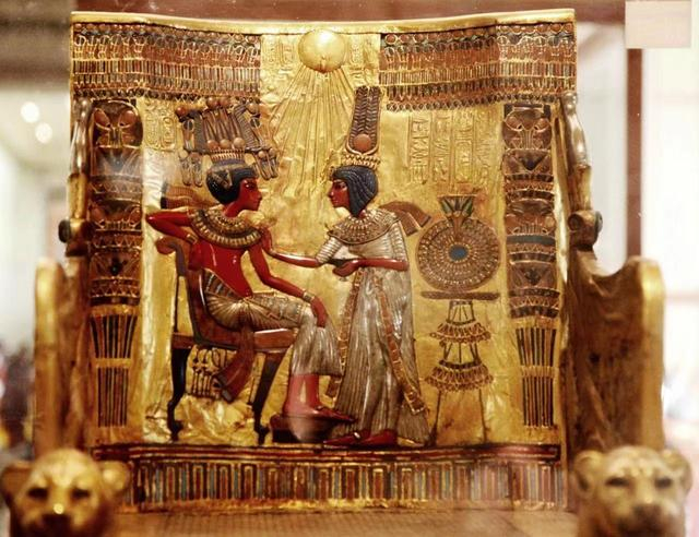 其中最为著名的是那把金制王座椅背上的浮雕画。在这幅画中,图坦卡蒙轻松惬意地坐在椅子上,注视着站在他面前的安克森纳蒙;身着华丽银裙的王后,则伸出手臂搭在丈夫的肩膀上,动作亲昵而温情。