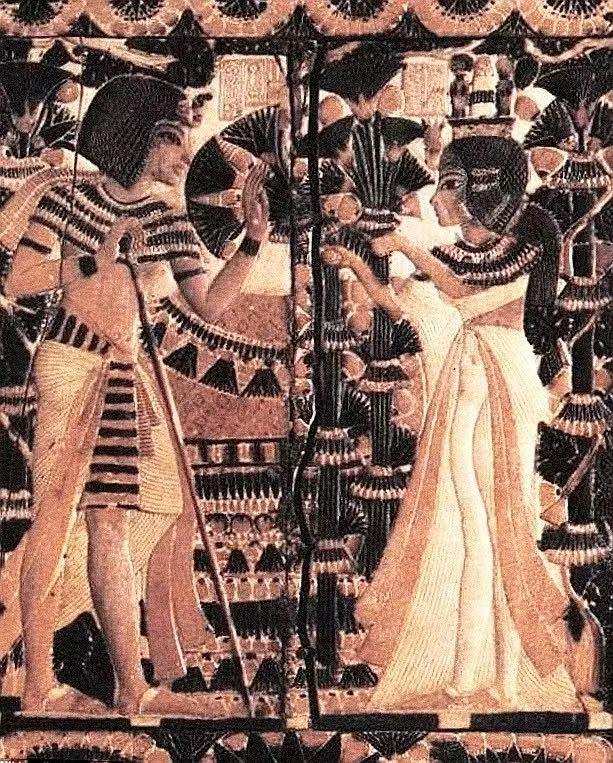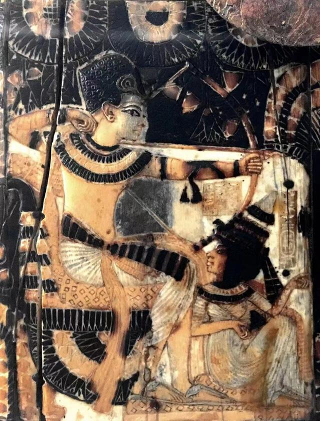 图坦卡蒙是埃赫那吞的异母弟弟,也是阿蒙霍特普三世的儿子。他娶了埃赫那吞的三女儿安克森纳蒙,墓中许多物品都记录了他们曾拥有的美好光阴——法老在花园里接过王后递来的花束;法老张弓射野鸭的时候,坐在他脚边的王后转过身来,递给他一支箭……
