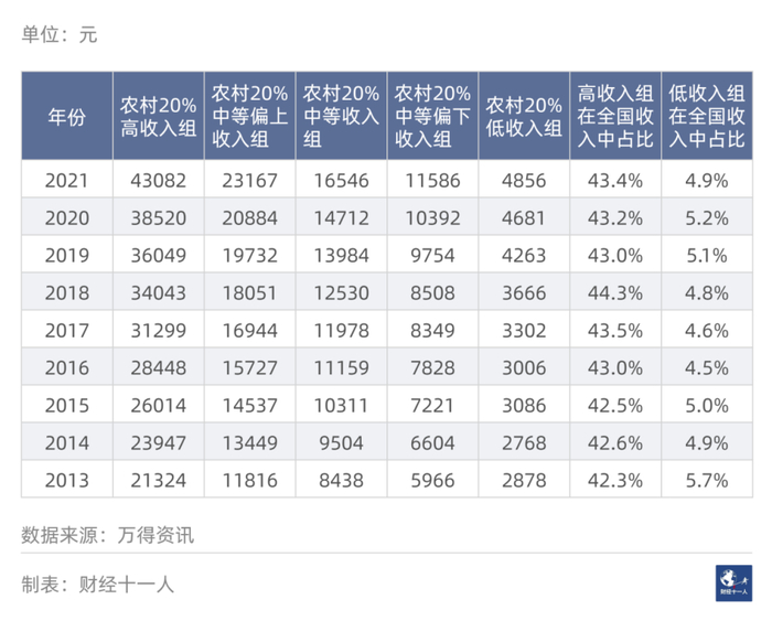 2021年农村高收入组年收入为43,082元。高收入组是低收入组的8.9倍。而2021年城镇高收入组是低收入组的6.1倍。有数据以来,城镇居民之间的贫富差距始终小于农村。
