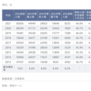 万得数据库(Wind)收集了2013年以来的相关数据。表1给出了这五组人群的人均可支配收入、收入年复合增长率、高收入组和低收入组在中国居民总收入中的占比等信息。