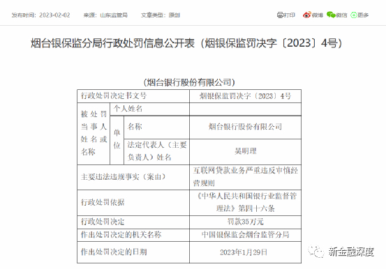 烟台银行因互联网贷款业务违规被罚35万元 联合贷款余额降幅达74%
