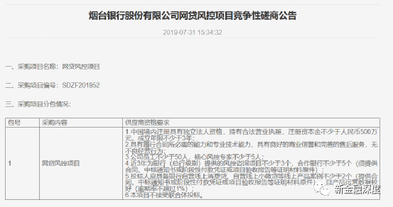 随后2019年8月,烟台银行又对网贷风控项目进行了公开招商。供应商资格要求中除了注册资本、技术能力等条件外,还明确提出核心风控专家不少于5人。近3年为银行(总行级别)提供的风控咨询项目不少于3个,合作银行不少于5个。投标人应具备银行自营线上消费贷、自营线上小微贷等线上产品案例不少于2个,且产品运营数据较好(逾期率不超过1%)。