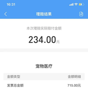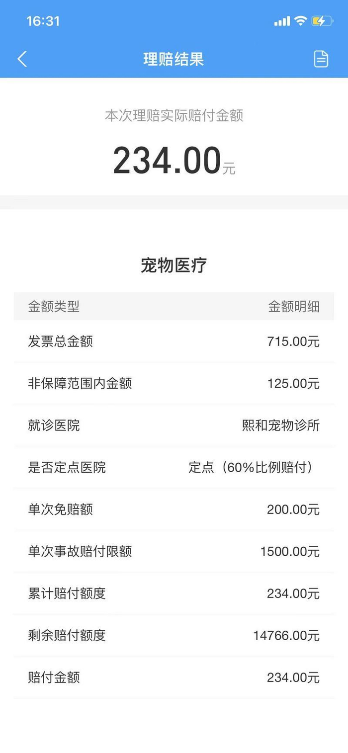 朱女士去年3月24日在支付宝购买了一款大地财产保险股份有限公司的宠物医疗险,总保险费399元,按月缴纳每个月33.25元,保额1.5万元。“后来我家狗狗狗因为连续腹泻5天,在附近一家宠物医院就诊,当时检查治疗总费用715元,因为含不能报销的项目,报销比例60%,最终自己承担481元。”朱女士说。
