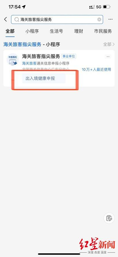 而支付宝则是搜“海关旅客指尖服务”,进入小程序后按照提示进行“出入境健康申报”。