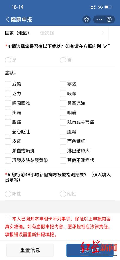 红星新闻记者注意到,“健康申报”内容包括出/入境信息、个人信息、交通工具、旅居地、身体症状等事项。申报通过后即可获得健康申报码,申报码仅限当次使用。为节约时间,可提前截图保存。旅客在抵达口岸后,凭海关健康申报码完成必要通关手续。