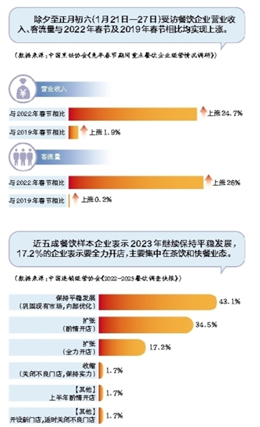 2022年年底,餐饮市场迎来回暖,一些餐饮品牌迅速开出新店,迎接春节旺季。数据显示,“年夜饭爆棚”“排队等位”等成为今年春节假期餐饮的“关键词”,同时,多家餐企的外卖营收均出现大幅增长。中国烹饪协会开展的相关调研数据显示,2023年1月21日至1月27日(除夕至正月初六),重点餐饮企业营业收入与去年春节相比上涨24.7%,与2019年春节相比上涨1.9%;客流量与去年春节相比上涨26%,与2019年春节基本持平。