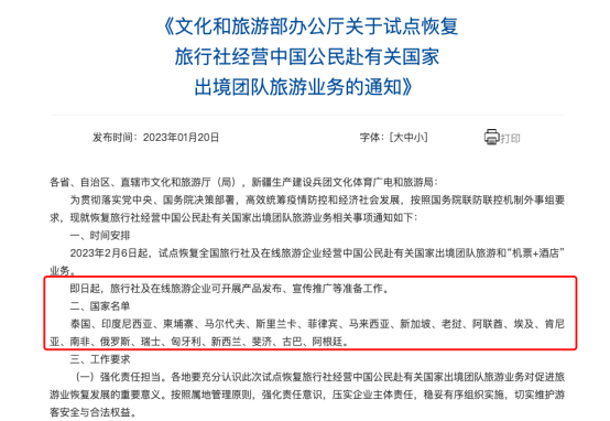 根据1月20日文旅部办公厅发布的通知,2月6日起,试点恢复全国旅行社及在线旅游企业经营中国公民赴有关国家出境团队旅游和“机票+酒店”业务。即日起,旅行社及在线旅游企业可开展产品发布、宣传推广等准备工作。