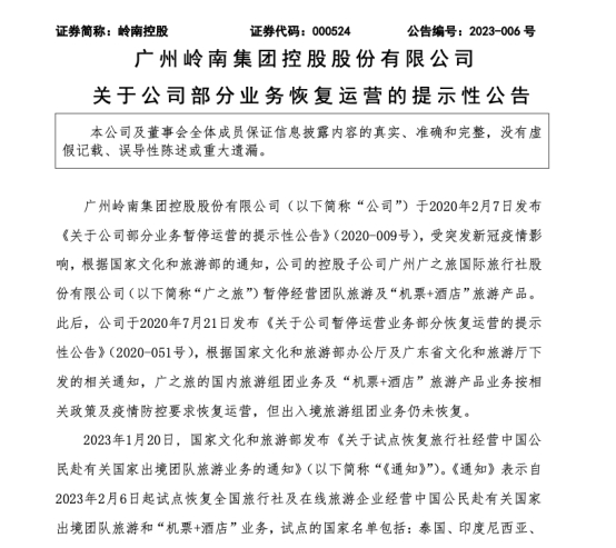 岭南控股近日发布公告称,其控股子公司广州广之旅国际旅行社股份有限公司已迅速开展出境游产品宣传推广和发布等工作,并严格按照文旅部《通知》要求和相关政策规定,积极恢复出境团队旅游和“机票+酒店”业务。
